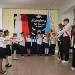 Po wprowadzeniu sztandaru szkoły i odśpiewaniu Hymnu Szkoły dzieci złożyły podniosłe słowa ślubowania. Później każdy pierwszoklasista został przyjęty do grona uczniów szkoły poprzez symboliczny gest pasowania. Nie zabrakło również gratulacji i pamiątkowych dyplomów. Po części oficjalnej pierwszaki otrzymały miłe niespodzianki, a wszyscy przybyli zostali zaproszeni do klas na słodki poczęstunek przygotowany przez rodziców.
