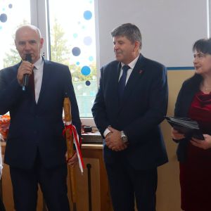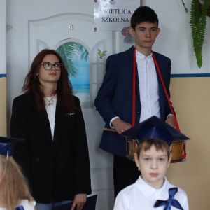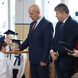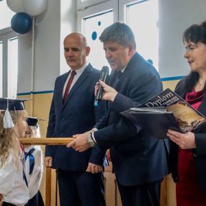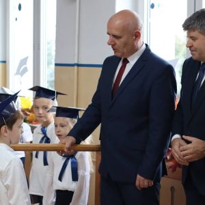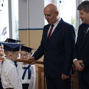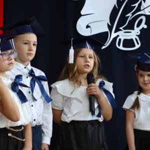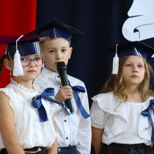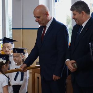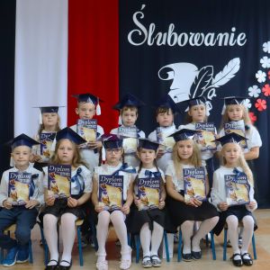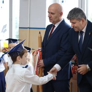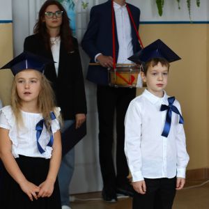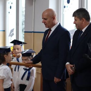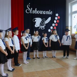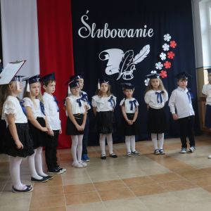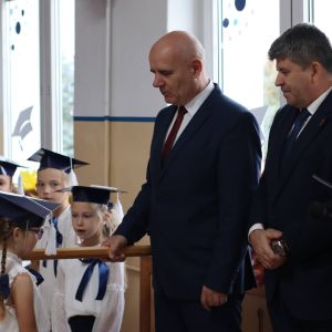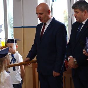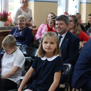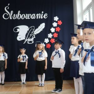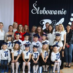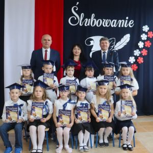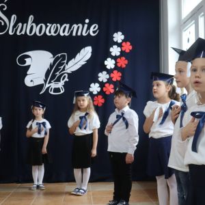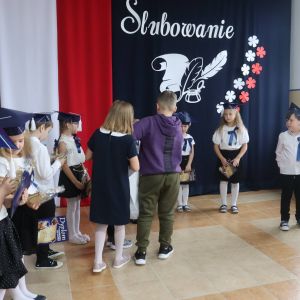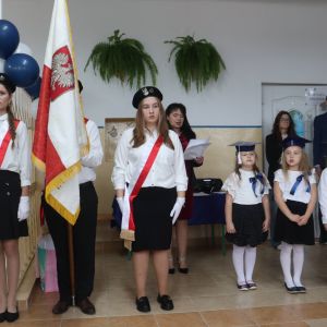 W dalszej kolejności poczet sztandarowy ceremonialnie wprowadził sztandar szkoły oraz został odśpiewany hymn narodowy, co rozpoczęło oficjalną część ślubowania. Następnie mali uczniowie złożyli uroczyste ślubowanie, a Pan Dyrektor wraz z Pan Wójtem dokonali aktu pasowania na uczniów klasy I, tym samym oficjalnie włączając ich do społeczności szkolnej. Najmłodszym uczniom zostały również wręczone dyplomy.