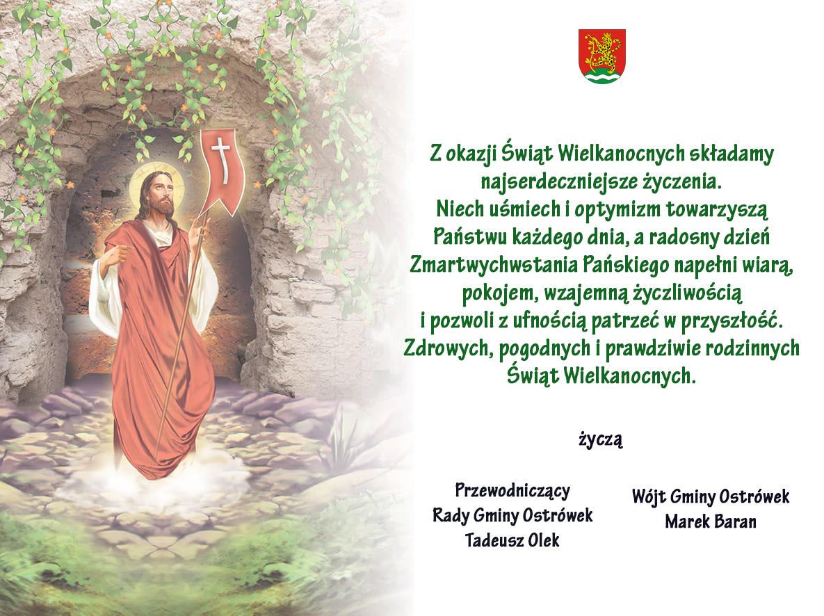 Z okazji Świąt Wielkanocnych składamy najserdeczniejsze życzenia. Niech uśmiech i optymizm towarzyszą Państwu każdego dnia, a radosny dzień Zmartwychwstania Pańskiego napełni wiarą, pokojem, wzajemną życzliwością i pozwoli z ufnością patrzeć w przyszłość. Zdrowych, pogodnych i prawdziwie rodzinnych Świąt Wielkanocnych życzą