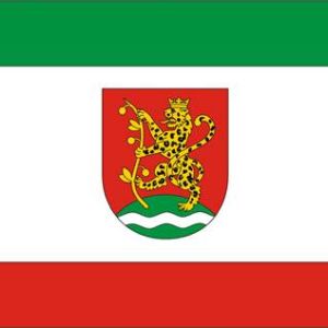 Flaga Gminy Ostrówek to prostokąt o kolorach: zielonym, białym i czerwonym w proporcji szerokości do długości 5:8.