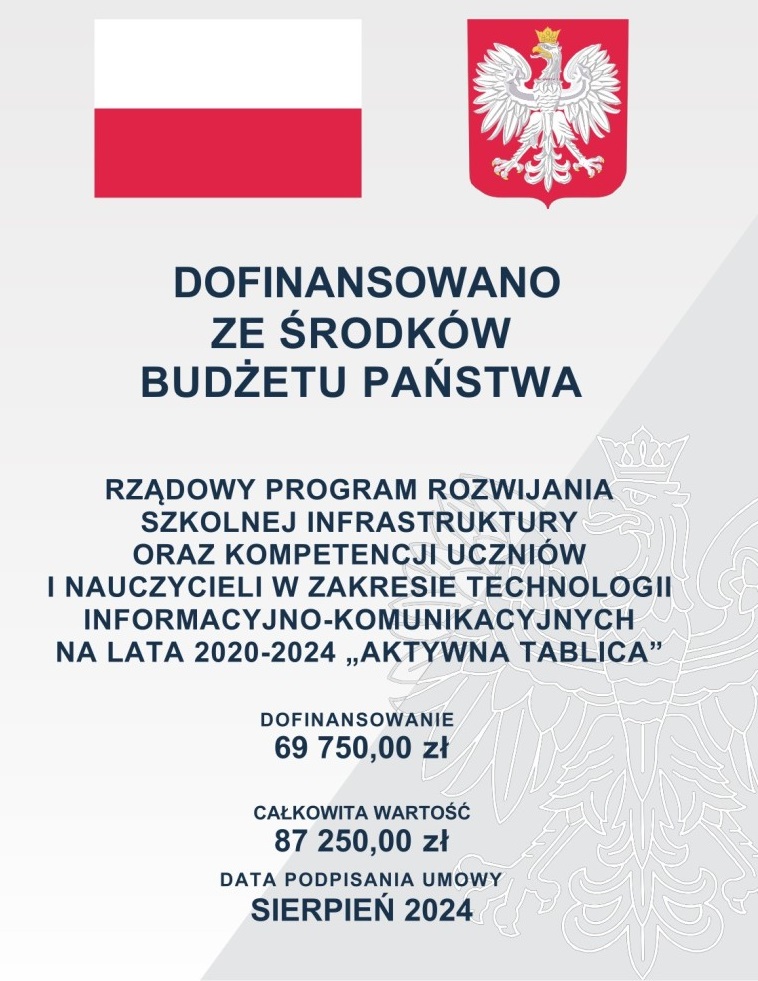 Gmina Ostrówek otrzymała dofinansowanie z budżetu państwa w postaci dotacji celowej w ramach realizacji Rządowego programu rozwijania szkolnej infrastruktury oraz kompetencji uczniów i nauczycieli w zakresie technologii informacyjno-komunikacyjnych na lata 2020-2024 – „Aktywna tablica” w wysokości 69 750,00 zł. Natomiast wkład własny Gminy wynosi 17 500,00 zł. Całkowita wartość zadania wynosi 87 250,00 zł